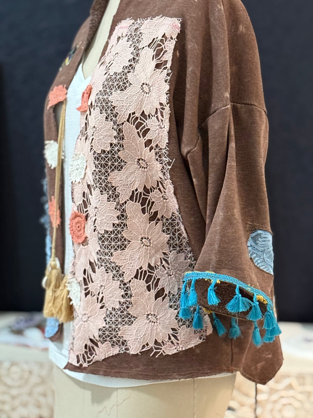 Look cute and feel cozy in this up-cycled mushroom kimono. Perfect for when you need a light layer, this flowy kimono was handmade from pre-owned pieces. The before and after shown in the photos depicts the body made from a sweatshirt and the blue fringe made from a tent canopy. This one of a kind top is environmentally friendly and a great addition to any wardrobe.