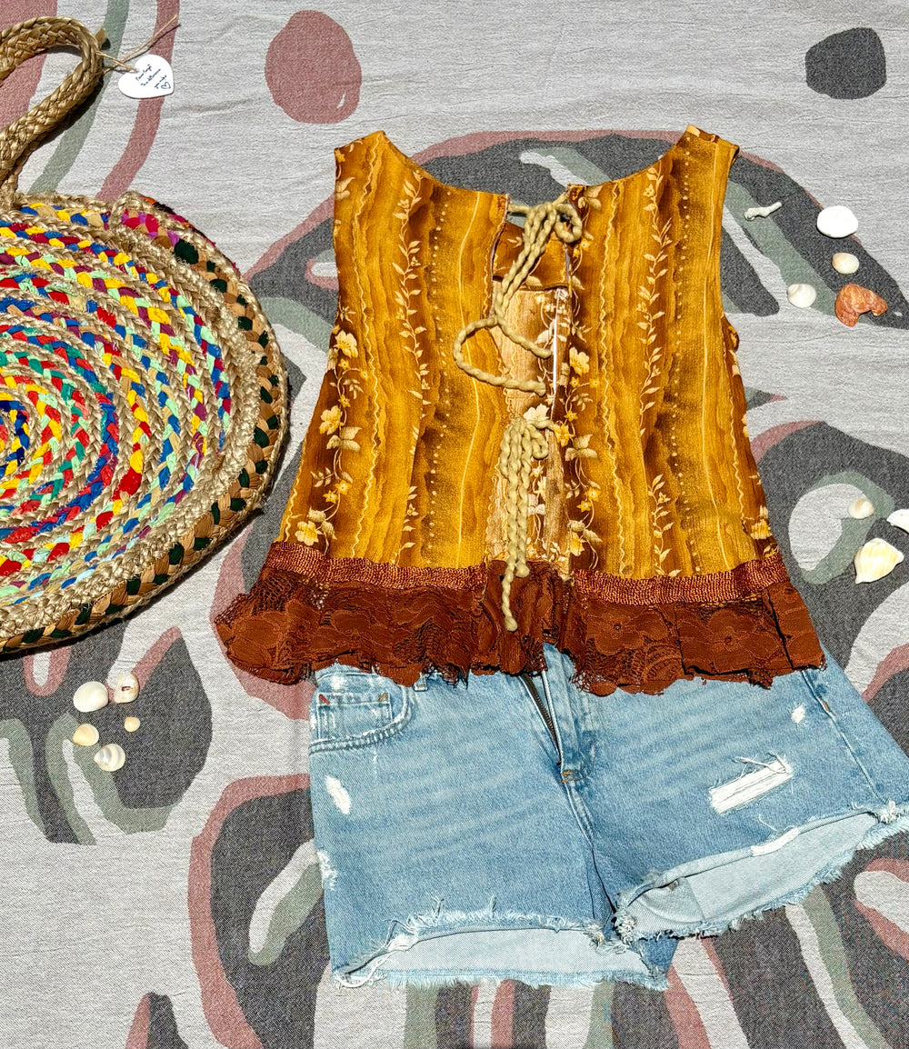 Channel late summer days in this one of a kind tank top. This button up was given a lively refresh as scrap lace was added to the bottom and the back was cut open and given yarn to tie it shut. Look and feel great knowing you're helping reduce clothing waste in this up-cycled tank.